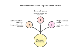 CONTEXT : India faces recurring monsoon-related disasters, with heavy rains causing floods and landslides across North India. The 2025 monsoon has been particularly destructive, with concentrated downpours overwhelming fragile Himalayan slopes, flooding plains, and damaging farmland. To break this cycle, India must prioritize preventive measures over reactive relief, focusing on climate-resilient infrastructure, early warning systems, and sustainable land management.