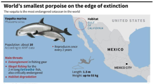 Context :A recent report reveals that only about 10 vaquita porpoises—considered the world’s rarest marine mammal—remain in the Gulf of California (Sea of Cortez), Mexico. Their population has drastically declined mainly due to accidental entanglement in illegal gillnets used to catch totoaba, an endangered fish valued for its swim bladder.