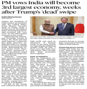 India–Japan relations are evolving beyond economic ties into a comprehensive strategic, technological, and security partnership, with Japan’s massive investment commitments reaffirming India’s role as a growth hub and gateway to the Global South. Despite challenges from U.S. criticism and global protectionism, Japan has emerged as a trusted partner, and the deepening cooperation in areas like supply chain resilience, green energy, and defence will be crucial for India’s march toward becoming the world’s third-largest economy while also strengthening Indo-Pacific stability.